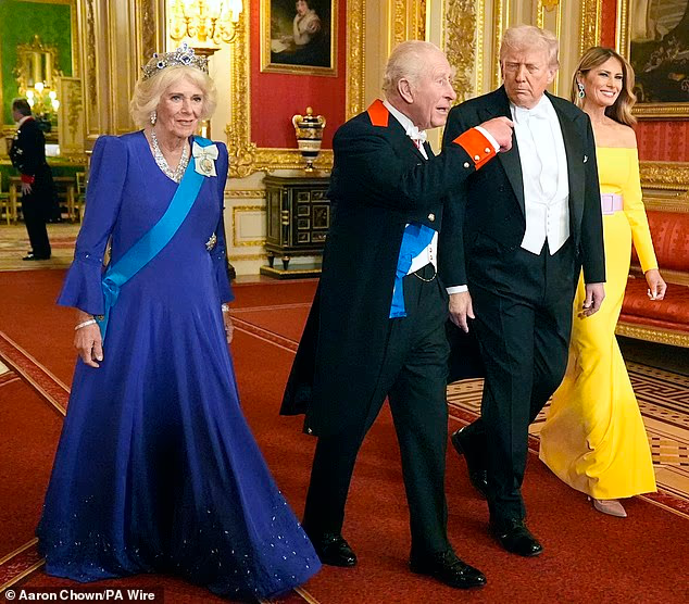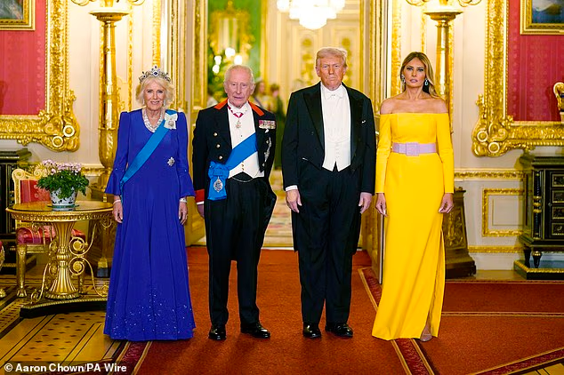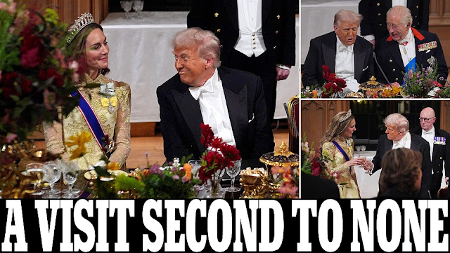 Donald Trump e Melania ao lado do Rei Charles III e da Rainha Camilla durante banquete real no Castelo de Windsor